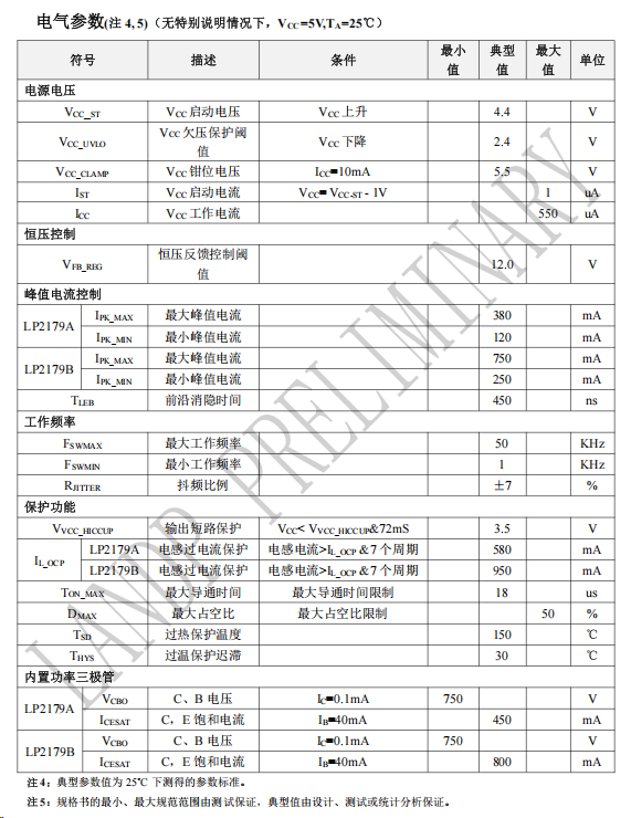 LP2179A 采用 SOP8L 封装,适用于 85VAC - 265VAC 全电压输入,在 12V 输出、温升≤40℃条件下,最大输出电流可达 200mA。其核心参数如下: