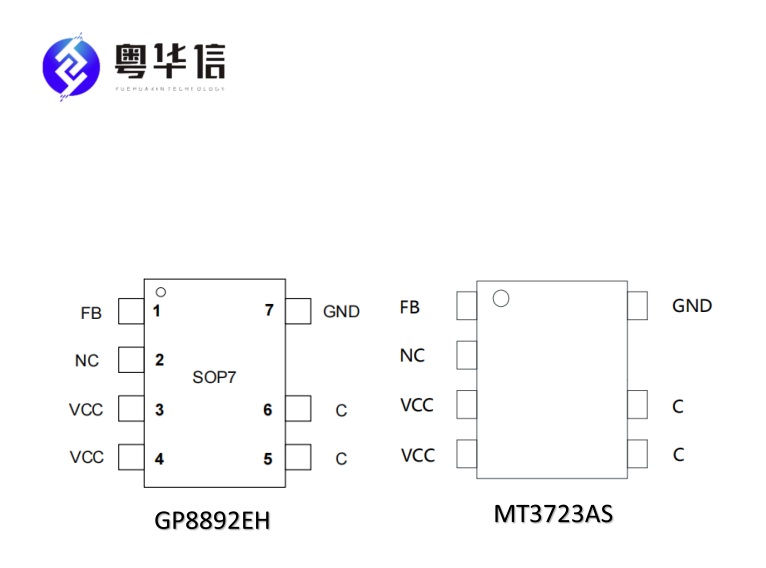 1、基础参数完全兼容均为 SOP7 封装、10W 内应用、自供电原边反馈架构,待机功耗≤75mW,内置功率三极管与 CS 采样电阻。且管脚功能一致,无需改动PCB.