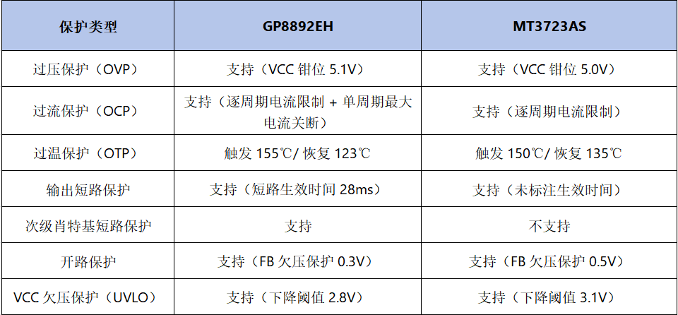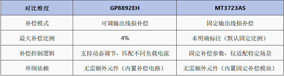 2、性能更优补短板MT3723AS 为固定线损补偿,GP8892EH 支持可调补偿(最大 4%),输出电压适配性更强;GP8892EH 多次级肖特基短路保护,防护比 MT3723AS 更全面。
